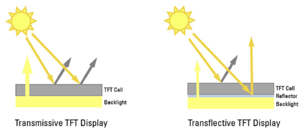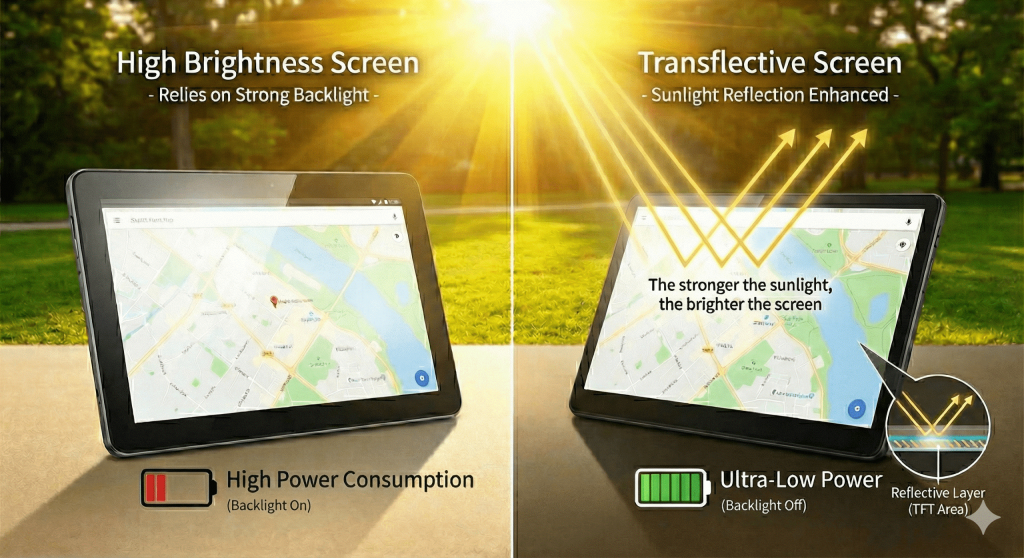 The transflective display is an innovative technology that combines the advantages of both reflective and transmissive displays. At its core is a special mirror-reflective film with the unique property of being reflective on the front and transparent on the back, integrated with a full-transmission backlight system. This enables automatic adjustment based on ambient light, effectively overcoming the traditional screen limitations of poor visibility in bright sunlight and inadequate clarity in low light.